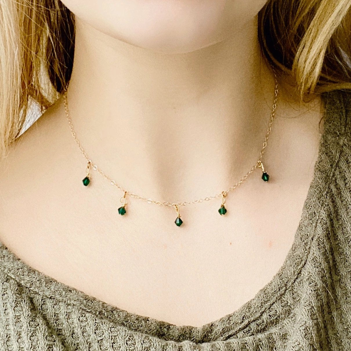 Emerald Green Crystal Choker Necklace Minimalist Jewelry, hand made with facetted petite crystals, wire wrapped on 14k gold filled chain,