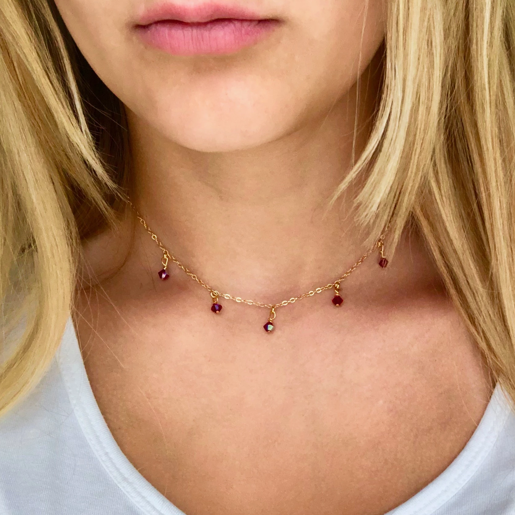 Ruby Red Crystal Choker Necklace, hand made with facetted petite crystals, wire wrapped on 14k gold filled chain, completed with a 14k gold